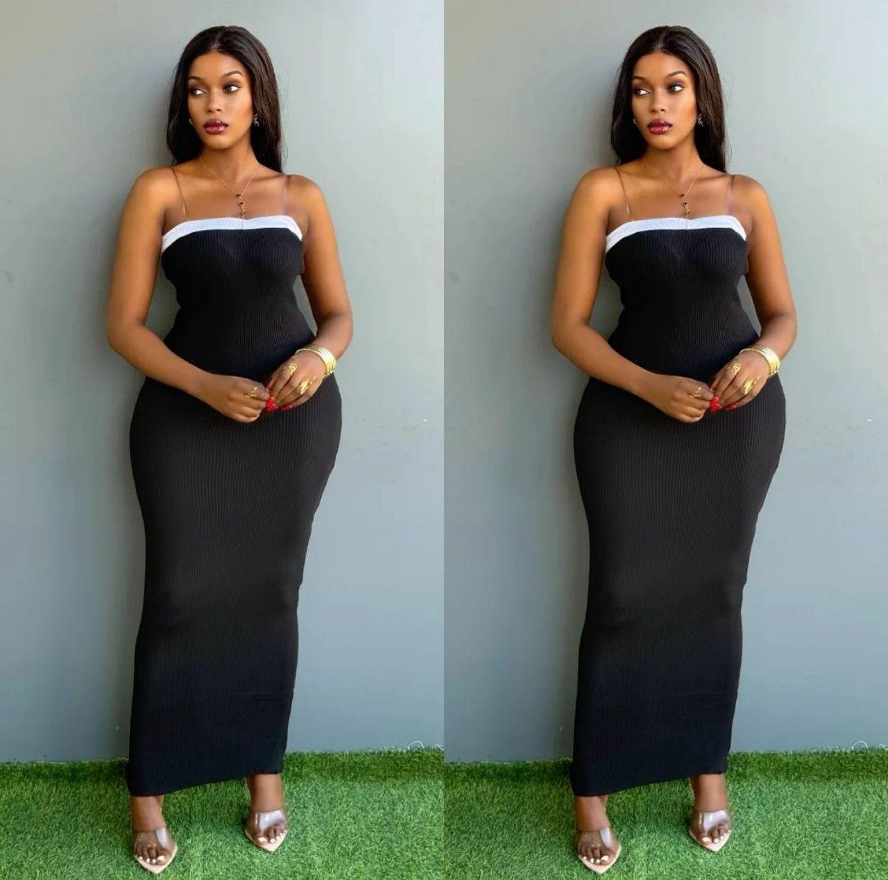 The design stands out with a striking white contrast stripe along the bust line, adding a modern, sporty edge. It features a strapless bodice supported by subtle clear (or invisible) spaghetti straps, giving a chic, almost floating neckline effect. The maxi length and bodycon fit make it ideal for evening wear, cocktail events, or glamorous date nights.