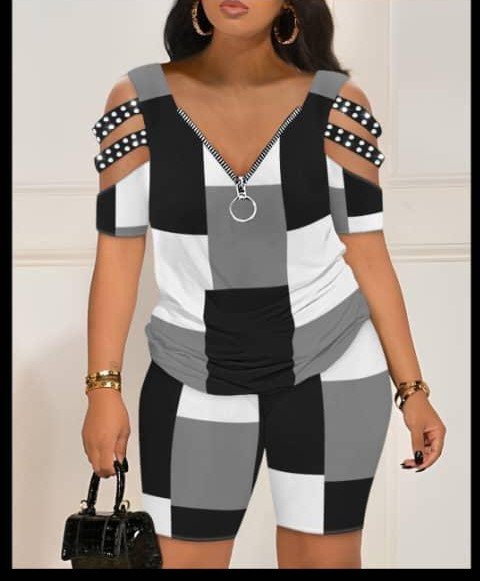 This stylish two-piece outfit features a bold black, white, and grey patchwork design with a modern geometric pattern. The top comes with a deep V-neckline accentuated by a zipper with a ring pull, adding a trendy edge. Its cold-shoulder design is enhanced with double-strap detailing decorated with polka dots for a playful touch. The fitted shorts complement the top, creating a coordinated and sleek look. Perfect for casual outings, parties, or fashionable streetwear, this set combines comfort with a striking contemporary style.
