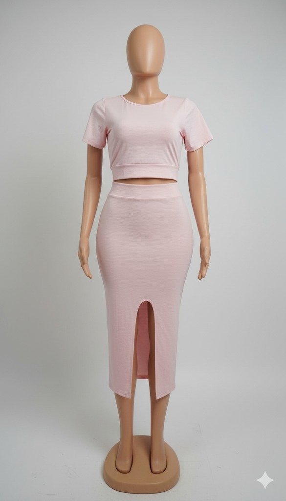 The set features a simple yet flattering short-sleeve crop top with a classic round neck and a matching high-waisted midi skirt. The skirt is cut in a comfortable bodycon silhouette to hug your curves and includes a stylish front slit for easy movement and a modern touch. The fabric appears to have a subtle texture (possibly a light rib knit or fine stretch material), adding dimension to the solid color.